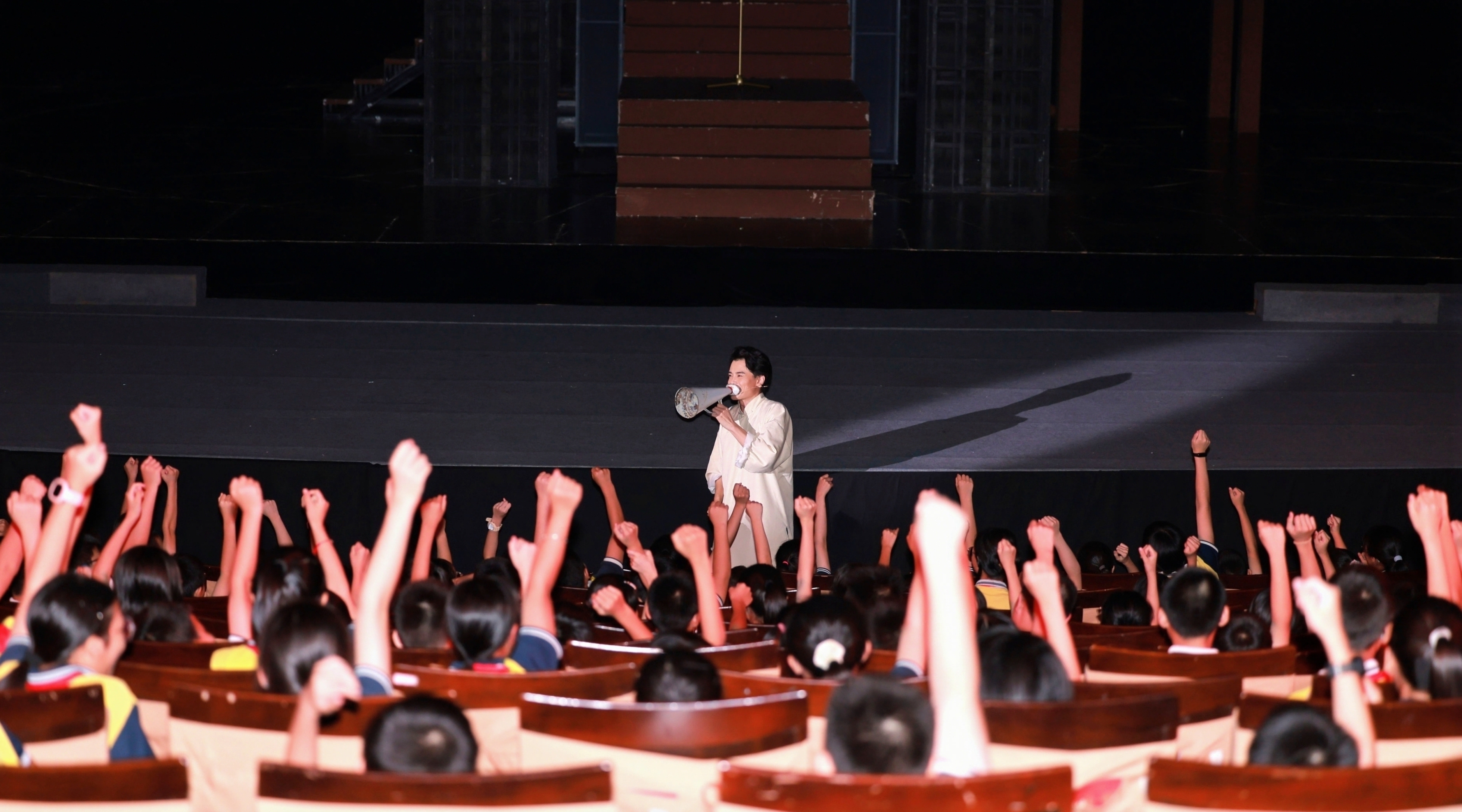 “100年后的孩子们,你们是不是每天吃得饱饭、睡得好觉了?”“你们是不是都过上好日子了?”……舞台上,《先锋少年》的演员激昂“喊话”台下观演的孩子们,一声声整齐而铿锵的“是”在剧场上空回荡,欢呼声和掌声持续不断。