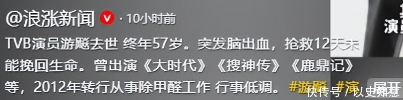 2月24日,香港TVB资深配角游飚先生因突发脑出血抢救无效辞世,终年57岁。