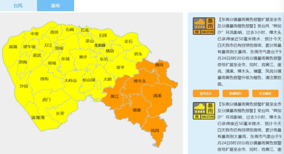 受台风“桦加沙”环流影响,过去3小时,樟木头已录得接近50毫米降水,预计今天白天我市仍有持续性降雨,累计雨量有暴雨到大暴雨,东莞市气象台于9月24日8时20分将分镇暴雨黄色预警信号扩展至全市,同时,将黄江、谢岗、清溪、樟木头、塘厦、凤岗分镇暴雨黄色预警升级为橙色,请注意防御。